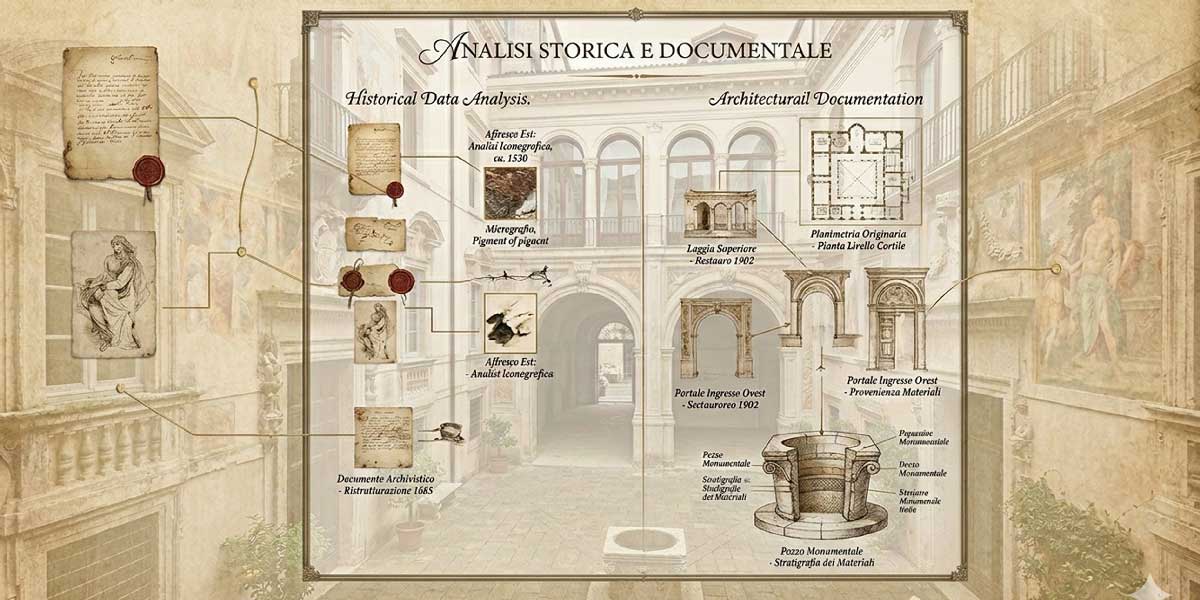 Il primo passaggio nel restauro di palazzi antichi non è il cantiere, ma la raccolta delle informazioni giuste. Prima di toccare intonaci, pavimenti, coperture o apparati decorativi, serve ricostruire la storia dell’edificio e capire come si è trasformato nel tempo. Questo lavoro aiuta a distinguere gli elementi originali dalle aggiunte successive, a leggere meglio i punti critici e a evitare errori che, in un restauro edificio vincolato, possono pesare sia sul piano tecnico sia su quello autorizzativo.
